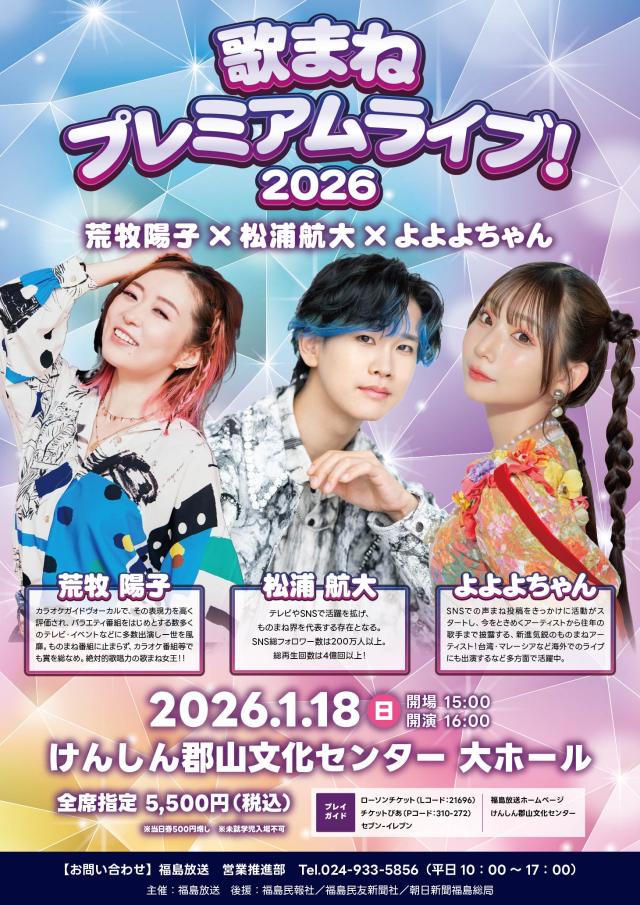 荒牧陽子・松浦航大・よよよちゃんによる夢の歌まねプレミアムライブ開催! 今をときめく3名の歌まねアーティストが織りなすプレミアムショー!