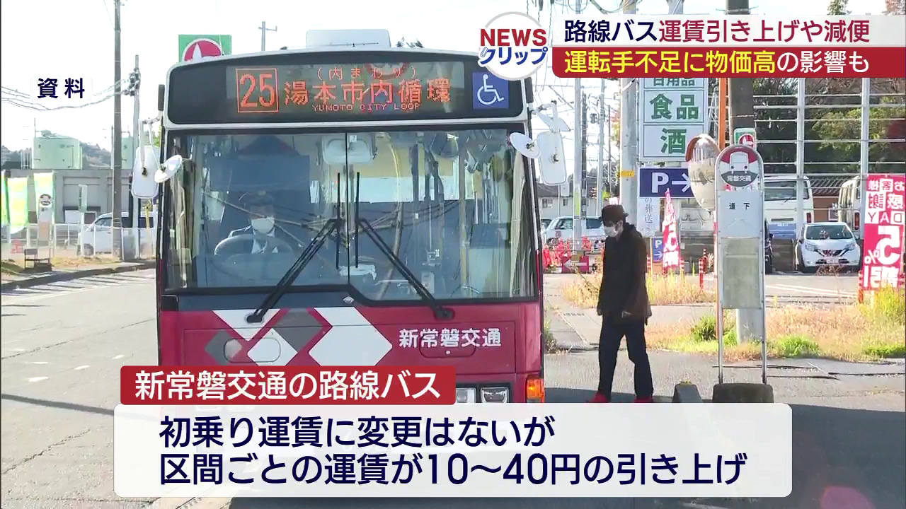 いわき市の新常磐交通は、物価高や運転手不足を理由に、15日から路線バスの運賃を引き上げ、一部路線の便数を減らしました。新常磐交通によりますと、路線バスの運賃では初乗り運賃に変更はありませんが、区間ごとに加算される運賃が10円から40円引き上げられます...