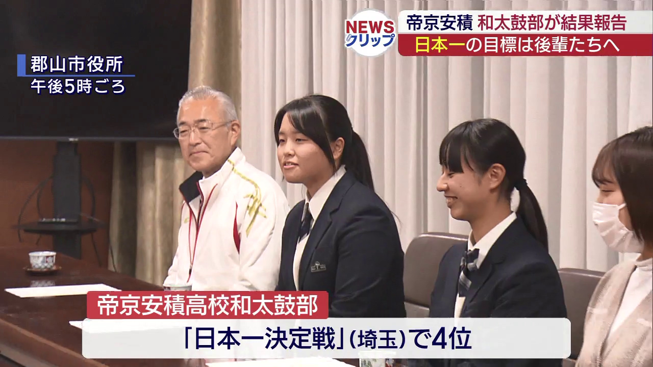 帝京安積高校和太鼓部が、14日に出場した全国大会の結果を、郡山市の椎根市長に報告しました。帝京安積の和太鼓部は埼玉で開かれた日本一決定戦に出場、全国の強豪を相手に4位の成績を収めました。前部長の柳沼茉奈果さんは「作り上げてきたものをすべて出し切れたと...