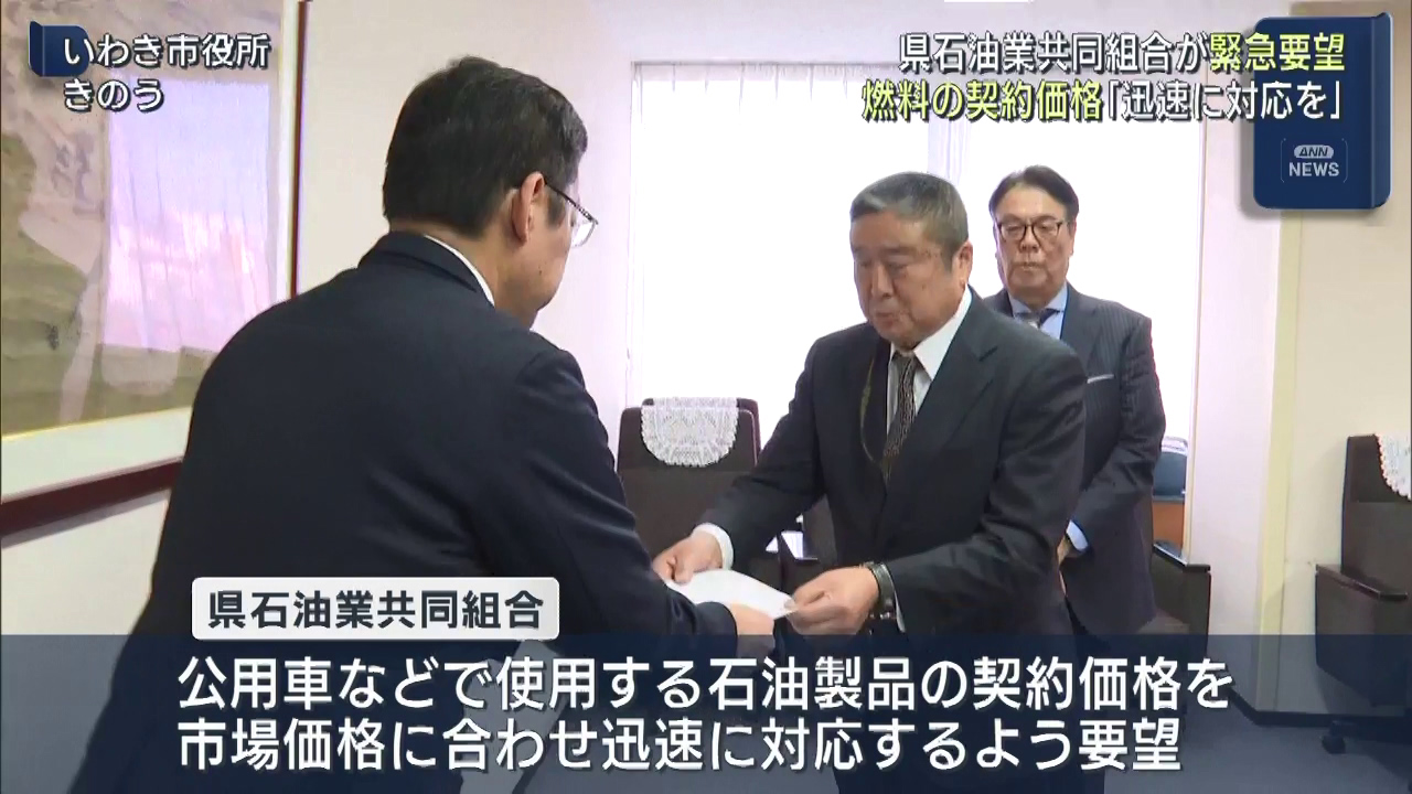 県石油業共同組合は、公用車などの燃料費の契約価格について、迅速に市場価格を反映するよう要望しました。県石油業共同組合は12日、公用車やゴミ処理施設などで使用する石油製品の契約価格を、市場価格に合わせて迅速に対応することをいわき市に要望しました。これま...