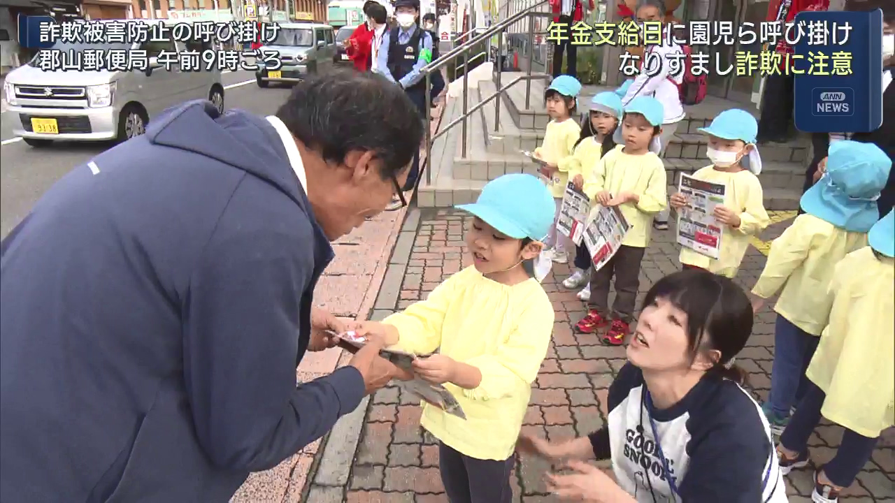 年金支給日の15日、郵便局で園児らが詐欺被害の防止を呼び掛けました。郡山郵便局では市内の保育所に通う園児らが、訪れた人たちに詐欺被害の防止を呼び掛けるチラシやティッシュなどを配りました。訪れた人は「色んな電話かかってきますね。知らない電話番号は取らな...