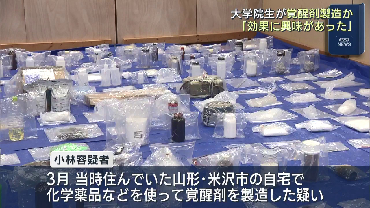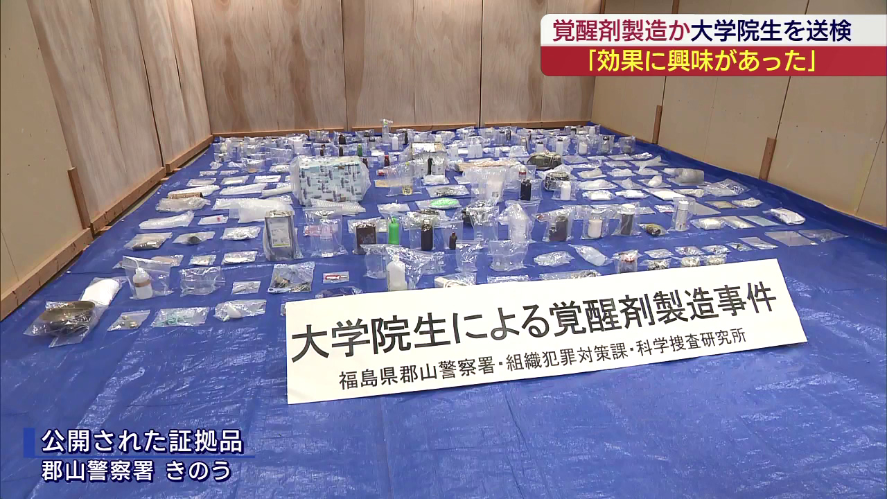 覚醒剤を製造した疑いで逮捕・送検された大学院生の男は、「覚醒剤の効果に興味があった」などと供述しています。ずらりと並べられた薬品や道具。容器に入った白い粉と液体のほかに数々の薬の瓶が公開されました。これらを使って覚醒剤を製造した疑いで逮捕されたのが、...
