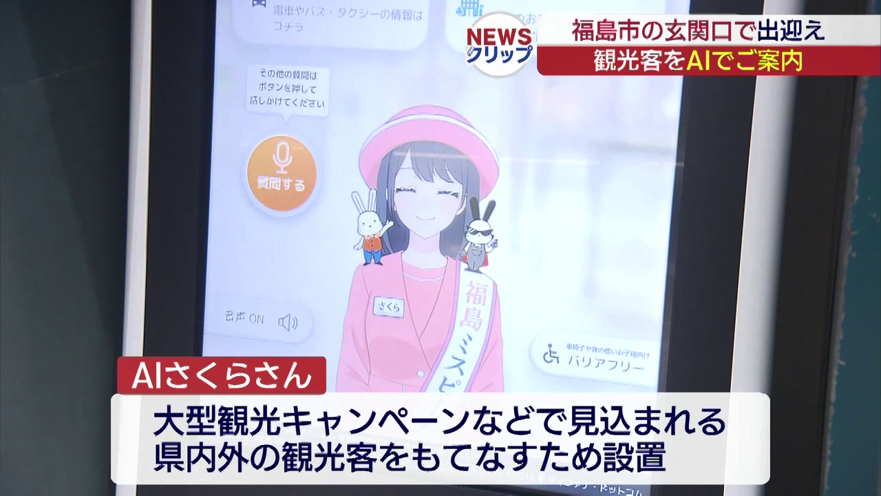 観光キャンペーンなどで訪れる人たちを出迎えるため、AIを使った観光案内サービスが始まりました。デジタル観光案内「AIさくらさん」は、大型観光キャンペーンなどで、見込まれる県内外からの観光客をもてなすため、福島駅東口の改札前に設置されました。5日本格的...