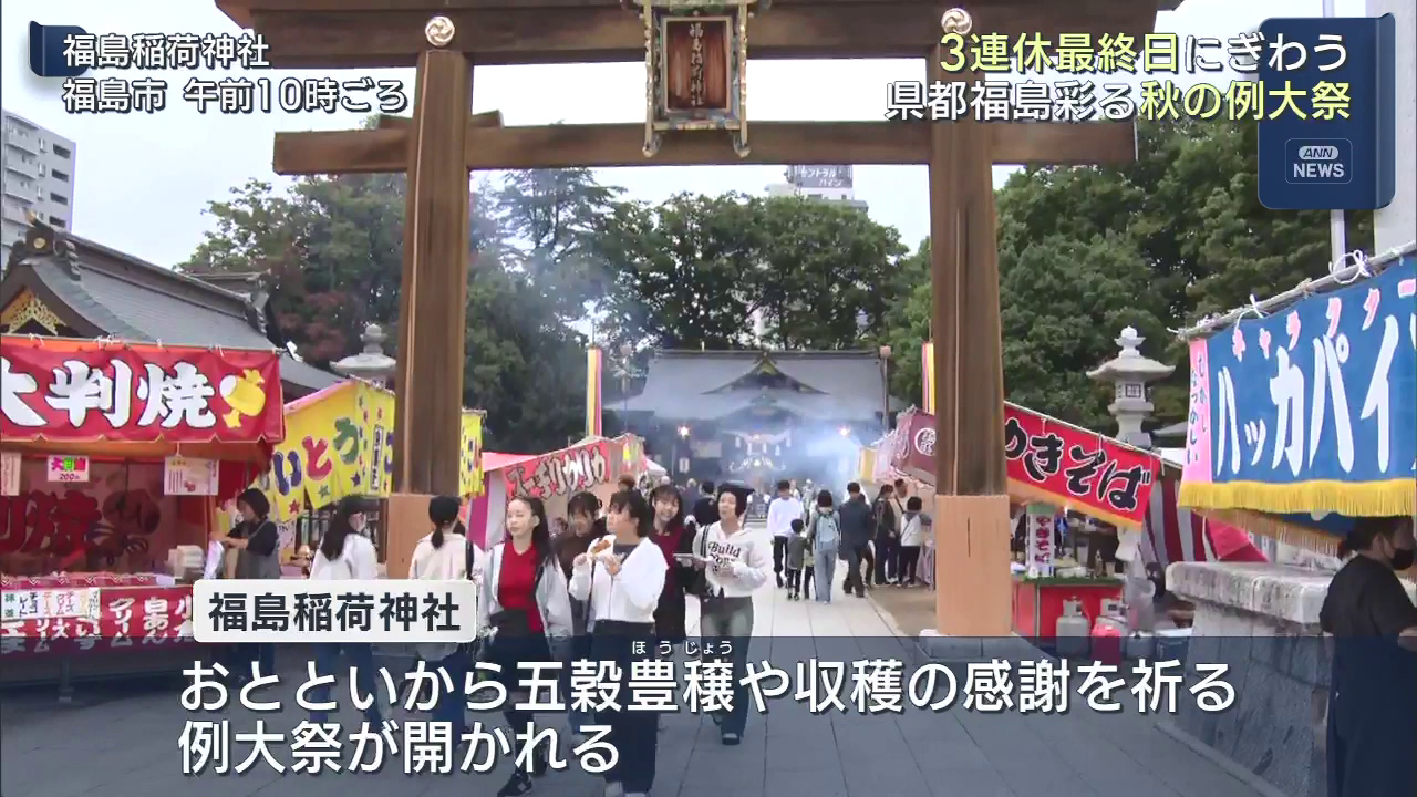 三連休最終日の13日、福島稲荷神社では県都・福島をにぎやかに彩る秋の例大祭が開かれています。福島市の福島稲荷神社では、11日から五穀豊穣や秋の実りに感謝する例大祭が開かれていて、3日目の13日は祭りの無事を願う神事が行われました。境内とその周辺には約...
