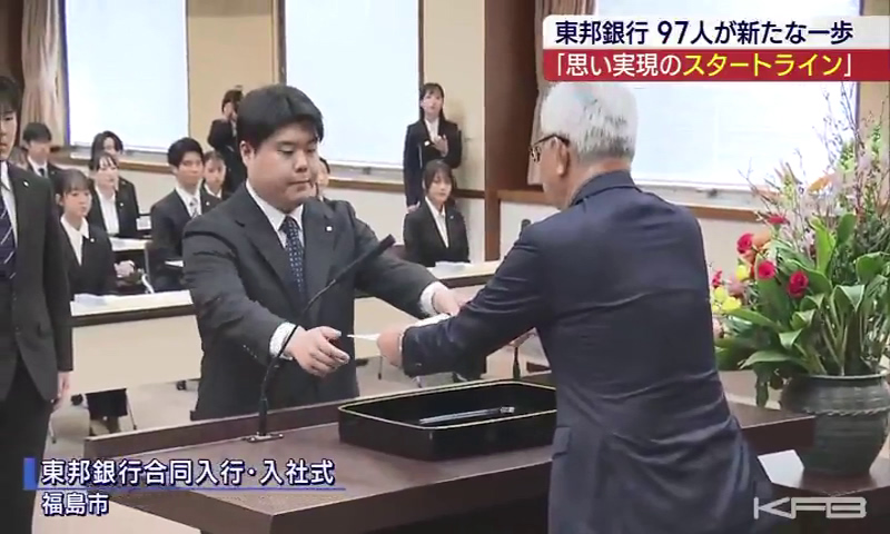 福島県福島市に本社を置く東邦銀行では、グループ会社を含めて97人が入行式に臨みました。新入行員を代表して、高澤音羽さんは「全ては地域のためにというパーパスのもと、金融サービスの枠を超え、福島のために尽力する東邦銀行に入行することは、福島への思いを実現...