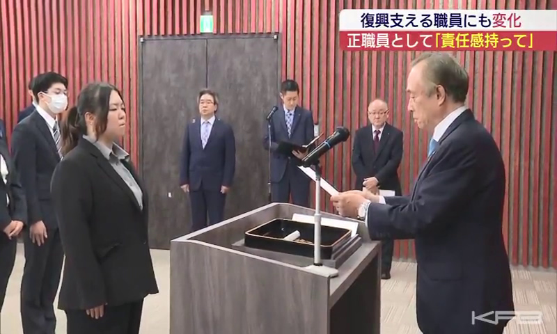 福島県双葉町役場で行われた辞令交付式。役場の任期付き職員などを7年勤めてきた双葉町出身の佐藤葉月さんは、1日から正職員として働き始めました。2026年度、正職員に採用された10人の中で、佐藤さんは唯一町内出身です。佐藤さんは「任期付き職員から正規職員...