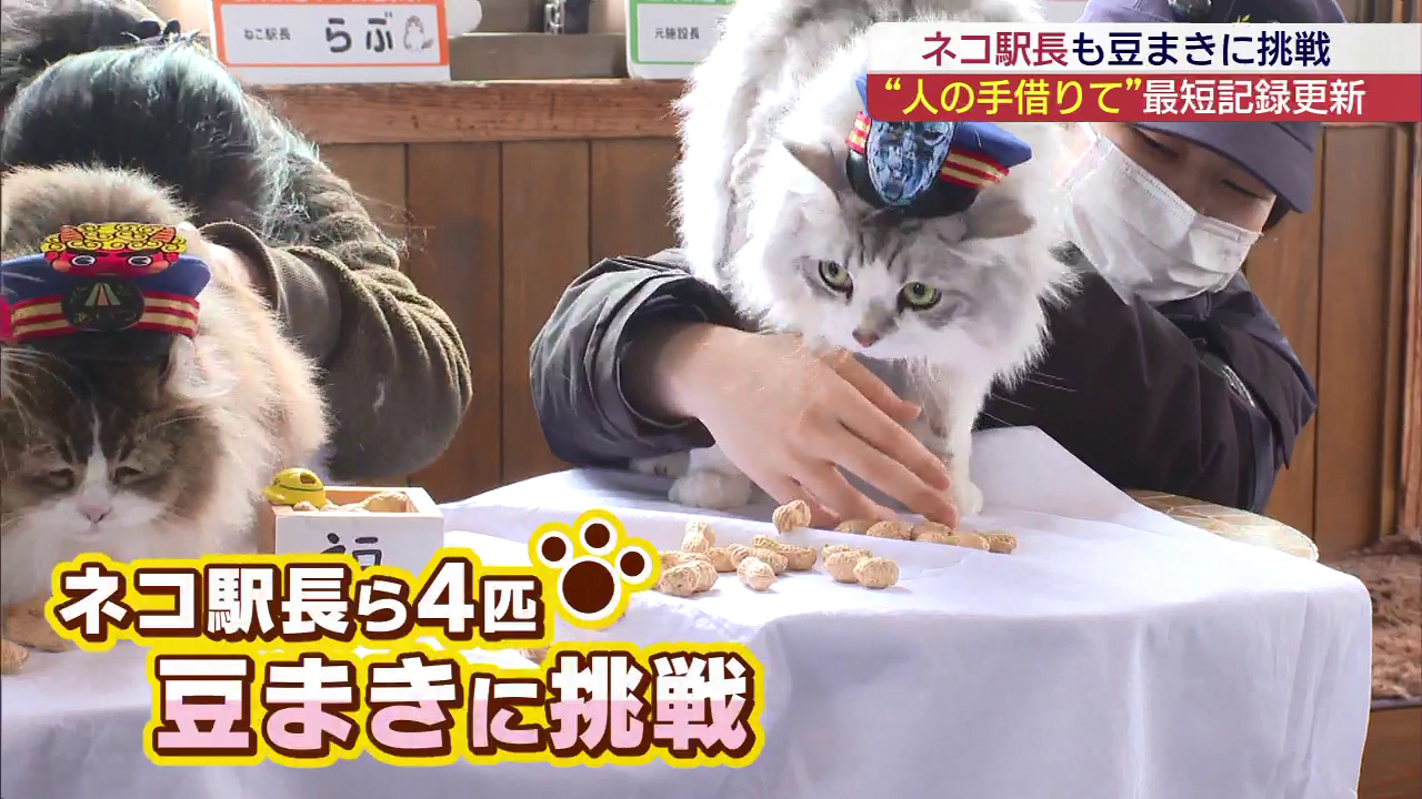 ネコの駅長が人気の芦ノ牧温泉駅では、鬼のお面をつけた3代目の駅長「さくら」と施設長の「ピーチ」、駅員の「そら」と「りく」が豆まきに挑戦しました。会津鉄道の安全を願って毎年行われていて、2026年も人の手を借りながら、過去最短の5分ほどで豆をまき終えま...