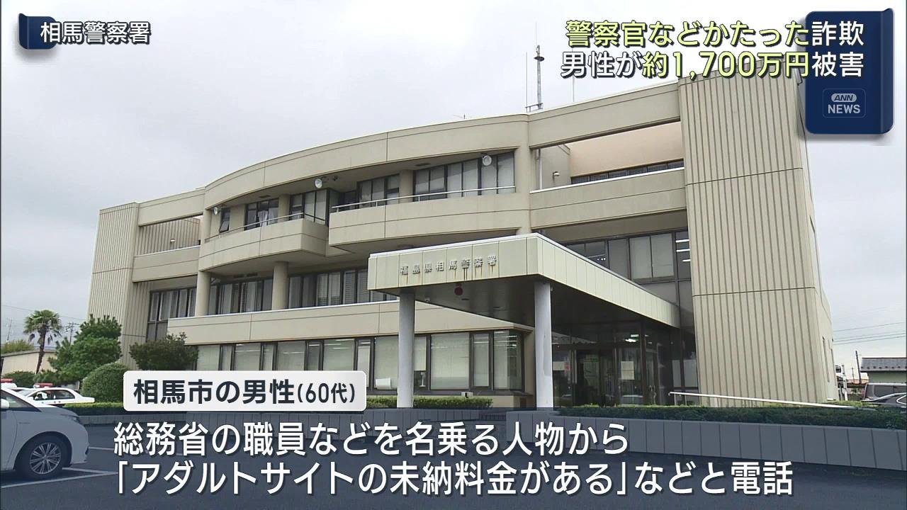 相馬市の60代の男性が、警察官などを名乗る人物の話を信じて、約1700万円をだまし取られました。警察によりますと9月、相馬市の男性(60代)に総務省の職員などを名乗る人物から「アダルトサイトの未納料金がある」などと電話がありました。その後、警視庁の警...