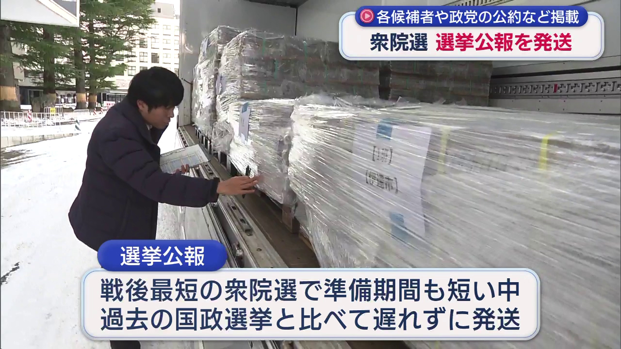 8日投開票の衆議院選挙の各候補者の主張や、政党の公約などを掲載した選挙公報が発送されました。県庁では、県選挙管理委員会の担当者が、トラックに積み込まれた選挙公報の部数を最終確認しました。今回の衆院選は解散から投開票までが戦後最も短く、準備期間も異例の...