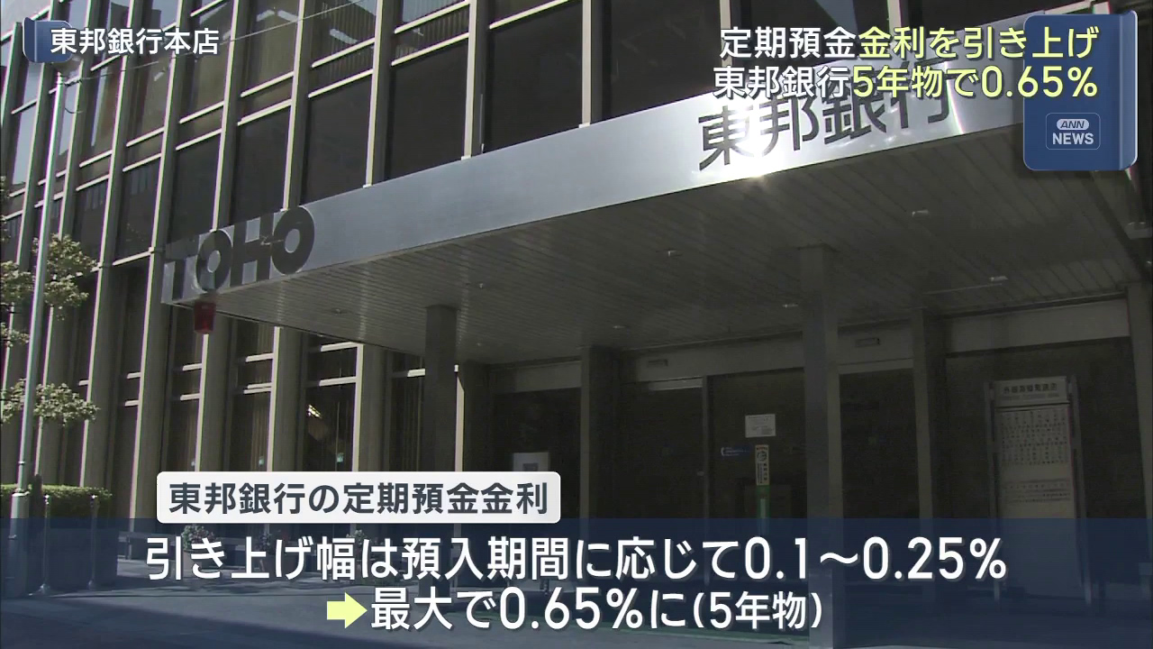 日本銀行の政策金利の引き上げに伴って、県内に本店を置く3つの地方銀行は2日から定期預金の金利を引き上げました。東邦銀行の引き上げ幅は定期預金の預け入れ期間に応じて0・1パーセントから0・25パーセントで、これにより定期預金金利は最高で預け入れ期間5年...