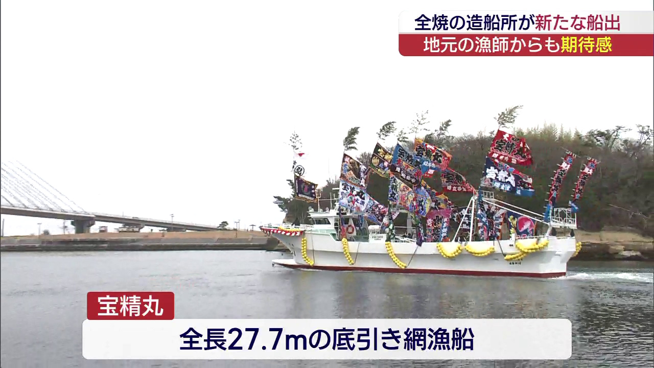 2年前に全焼した相馬市の造船所が再開し、初めて完成した船の進水式が30日に行われました。相馬市松川浦で行われたのは、松川造船で造られた「宝精丸」の進水式です。全長27.7mの底引き網漁船が松川浦に初めて浮かび、大漁旗をなびかせながら航行しました。松川...