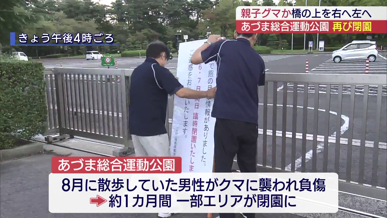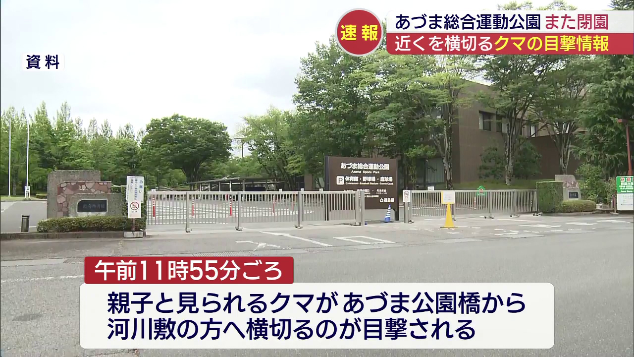 6日正午ごろ、福島市のあづま総合運動公園の近くで、クマが目撃され、公園は全域で閉園しています。公園を管理する担当者によりますと、6日午前11時55分ごろ、あづま公園橋から河川敷の方へ横切る、クマの目撃情報がありました。これを受け、あづま総合運動公園は...