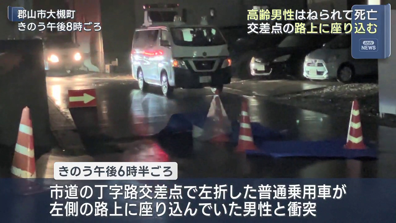 6日夜、郡山市で路上に座り込んでいた高齢の男性が、車にはねられ死亡しました。警察によりますと、6日午後6時半ごろ、郡山市大槻町の市道の丁字路交差点で、左折した普通乗用車が、左側の路上に座り込んでいた男性と衝突しました。はねられた男性は、搬送先の病院で...